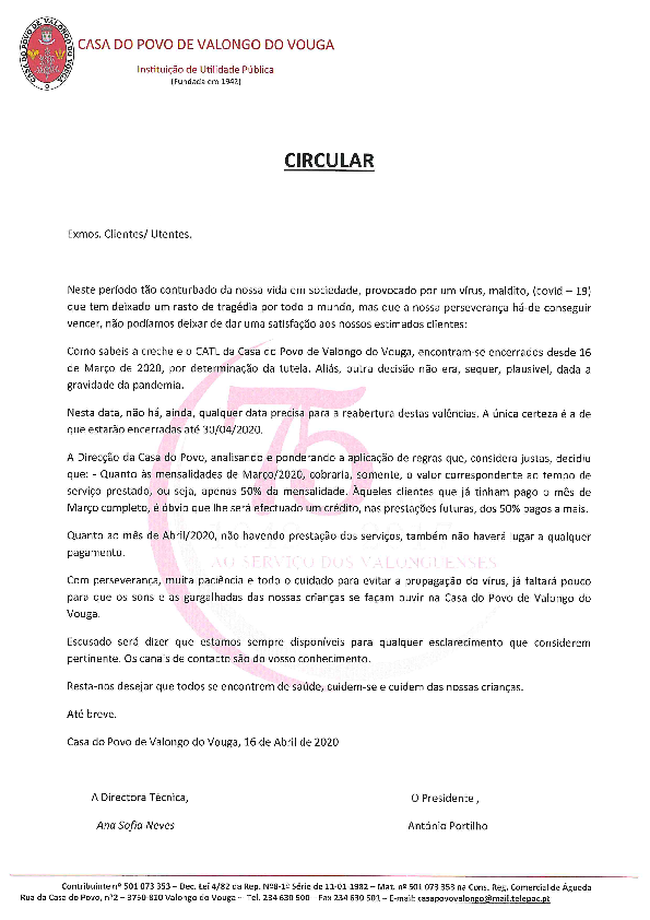 “No atual cenário, tomando uma atitude socialmente responsável, sendo desaconselhado a realização de reuniões e indo ao encontro das recentes medidas comunicadas ao país pelas autoridades para prevenção e contenção da proliferação da pandemia do vírus COVID-19, a Casa do Povo de Valongo do Vouga informa que, a Assembleia Geral Ordinária agendada para o dia […]